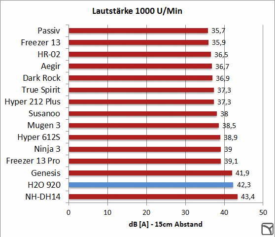 So beeindruckend die bisherigen Ergebnisse waren, so ernüchternd fällt der Vergleich bei festen Drehzahlen aus. Laufen alle Testteilnehmer mit identischen Umdrehungen, kann sich Antecs Luxuskühler nur bei 1200 U/Min knapp an die Spitze setzen. Mit weiter sinkender Lüftergeschwindigkeit wird das Produkt fix ans Ende des Testfeldes durchgereicht und ist mit 800 Rotationen schließlich sogar schlechter als der nur 22 € teure Freezer 13 Pro von Arctic. An einen Betrieb mit nochmals geringerer Drehzahl ist aus zweierlei Gründen nicht zu denken: Zum Einen ließen sich beide Lüfter nur bis 600 U/Min herabregeln, zum Anderen war bereits hier kein stabiler Betrieb der CPU mehr möglich, ohne die integrierte Schutzschaltung auszulösen. Grund für niedrige Drehzahlen gibt die H2O 920 also nicht - Antec hat eine Powerkühlung für Performanceuser gebaut, die Drehzahlen braucht wie manche Frauen Hiebe. Ups - das bleibt unter uns! Neben dem Leistungsabfall bleibt außerdem ein Lautstärkegewinn unter 1000 Umdrehungen aufgrund des Pumpengeräusches aus.
