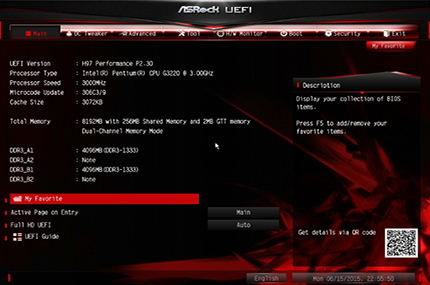 Im Prinzip ist das UEFI genauso aufgebaut wie das klassische BIOS und verfügt genau über die gleichen Funktionen und Konfigurationsmöglichkeiten. Dank der Easy Driver Installer Funktion, lassen sich benötigte Treiber in Verbindung mit einem USB-Stick auch ohne DVD aktualisieren. Besonders auffällig ist außerdem die Möglichkeit des Übertaktens, obwohl dieses Feature von Intel lediglich dem Z-Chipsatz vorbehalten ist, sind auch beim H97 Chipsatz einige, wenn auch nicht alle Einstellungsmöglichkeiten vorhanden. So gibt es z.B. nicht die Möglichkeit, den BCLK und dadurch den Takt des RAMs anzuheben. Da Arbeitsspeicher mit einem maximalen Speichertakt von höchstens 1600 MHz unterstützt wird, findet das sehr beliebte und nützliche XMP-Profil ebenfalls keine Anwendung. Unter dem gesonderten Reiter My Favorite ist es zudem möglich, die beliebtesten Einstellungsmöglichkeiten übersichtlich in einer Favoritenliste abzulegen. Mit der aktuellen UEFI Version P2.30 hielt außerdem die Unterstützung für die fünfte Generation von Intels Core i, Pentium und Celeron CPUs, die auf den Codenamen Broadwell hören, Einzug. Um vor fehlerhaften Aktualisierungen der Firmware zu schützen, verfügt das Mainboard über ein Dual-BIOS, dass es dem Anwender ermöglicht, die bereits bestehende Version erneut auf das primäre BIOS zu überspielen.