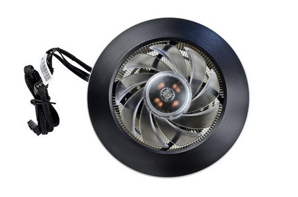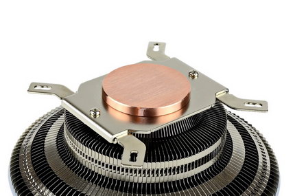 Die Kühlfinnen sind komplett kreisförmig und in Pilzform aufgebaut, wobei der untere Sockelbereich zu Gunsten der umliegenden Mainboard-Komponenten einen geringeren Durchmesser hat. Die Finnen sind fein angeordnet und durch eine umgebogene Lasche mit der jeweils nebenliegenden Finne verzahnt, wodurch der Korpus stabilisiert und robuster wird.