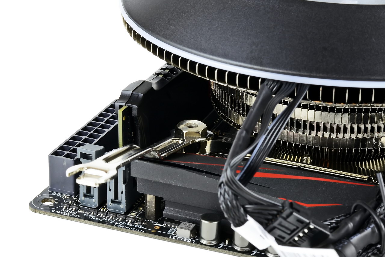 Wie bei jedem breiten Kühler muss man auch hier den Sockelabstand des Prozessors zu dem PCIe-Slot und den Boardkanten beachten. Während dies bei ATX- sowie mATX-Platinen weniger problematisch ist, muss man bei mITX etwas genauer hinschauen. Unser Review-Mainboard (ASUS Z170I Pro Gaming) hat einen recht mittig sitzenden CPU-Sockel, wodurch es keine Probleme mit dem PCI-Slot gibt. Die obere Boardkante wird hier nur um ca. zwei Millimeter überschritten, was bei den meisten Gehäusen nicht relevant sein dürfte. Viele aktuelle mITX-Platinen haben inzwischen einen fast zentral sitzenden Sockel, wodurch es da zumeist kein Problem geben sollte. Wenn man sich aber einmal andere Modelle ansieht, wird einem schnell klar was wir meinen.