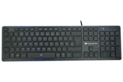 Cougar wählt ein äußerst schlichtes Design, welches die Beleuchtung besonders hervorhebt. Das Layout ist getreu dem 105 ISO-DE klassisch gehalten, nur die „FN“-Taste sind zwischen der Windows- und Alt-Taste untergebracht. Diese dient der Betätigung von Sonderfunktionen. Zusätzlich wurden neben den drei bekannten Anzeigen für „Num“- und „Capslock“ sowie „Rollen“ noch eine weitere LED installiert, um eine gesperrte Windows-Taste zu signalisieren.
