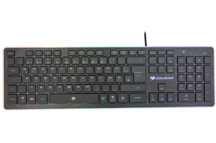 Alle Tasten liegen auf einer Ebene, daher gibt es hier keine anatomische Formung. Prinzipiell ist das kein Problem; viele Tastaturen setzen jedoch auf eine für die Hände angenehmere Formgebung, also auf eine verbesserte Ergonomie. Kritisch sehen wir das hier allerdings nicht, da die Tasten generell näher beieinanderliegen und man sich eher am Design von Laptops orientiert. Insofern imitiert Cougar die Vorlage sehr gut. Zumindest hatte der Redakteur mit seinen relativ großen Händen keine Probleme, alle Tasten zu erreichen.