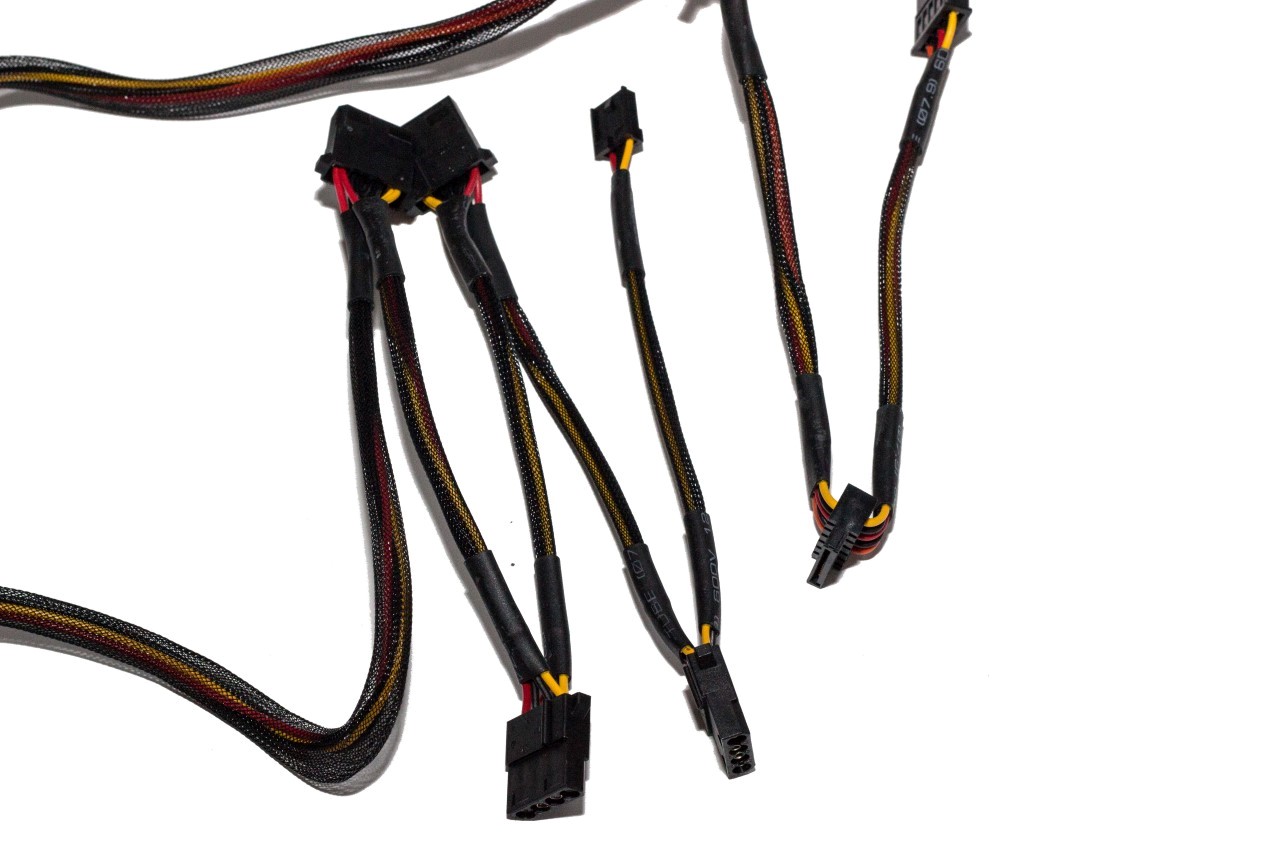 Die Kabel sind - wie bei einem Einsteigermodell zu erwarten – nicht perfekt. Enermax hat alle Sleeves sauber mit selbstklebenden Schrumpfschläuchen abgeschlossen und auch die Kabelstücke zwischen den einzelnen Steckern (bei Laufwerkskabeln oder dem PCIe 6+2 Pin Kabel) ebenfalls gesleeved. Allerdings sind die Sleeves allesamt nicht straff gezogen und (mit Ausnahme des Sleeves des 20+4Pin Kabels) auch nicht wirklich blickdicht.
