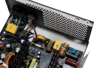 Als Shunts kommen für alle drei Schienen Spulen auf Stab-Ferritkernen zum Einsatz, welche auch mit dem Controller verbunden sind - OCP und OVP sind also auf allen Schienen implementiert. Eine OTP wäre über den PFC Controller implementierbar - da wir aber keinen Temperatursensor finden konnten, ist ungewiss, ob eine solche implementiert ist. In unseren Belastungstests gab das Netzteil aber keinerlei Anlass zur Sorge.