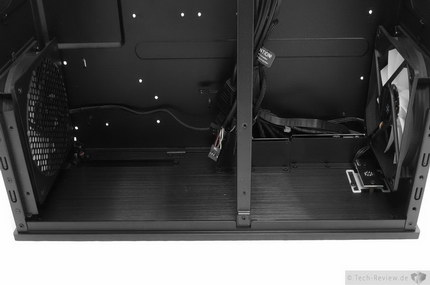 Der Innenraum des Node 605 sieht für die äußeren Ausmaße gar nicht so luftig aus. Dies ist den beiden Festplatten- beziehungsweise SSD-Aufnahmen zu verdanken. Tragisch ist dies aber lange nicht, denn unter diesen Halterungen bleibt recht viel Raum für den anfallenden Kabelsalat. Um gleich beim Thema zu bleiben, denn beim Kabelmanagement sieht es eher mau aus. Kabel können leider nicht hinter dem Mainboardtray versteckt werden, das liegt an der doch eher schmalen Ausrichtung des Gehäuses. Aber mal ehrlich, wer möchte schon einen höheren HTPC nur wegen des besseren Kabelmanagements in Kauf nehmen?