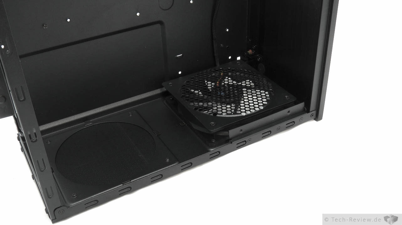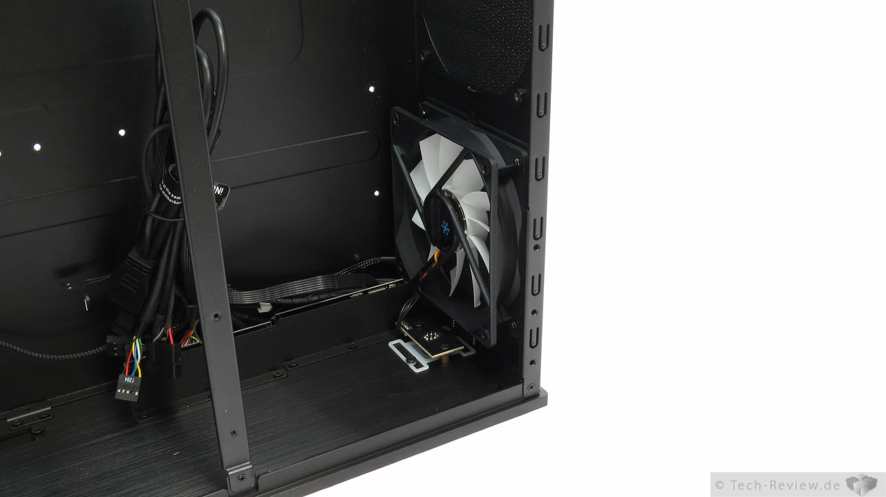 Werksseitig sind zwei Lüfter im Node 605 verbaut, welche direkt mit der internen 3-stufigen Lüftersteuerung verbunden worden sind. Der eine Lüfter, der sich in direkter Reichweite zum Netzteil befindet wurde zusätzlich mit einem Lüftergitter ausgestattet. So kann dieser durch Kabel nicht mehr außer Gefecht gesetzt werden. Eine optionalen Lüfter kann man ebenfalls noch mit der Steuerung verbinden. Die drei übrigen optional verbaubaren Lüfter müssen dann anderweitig angeschlossen werden. Sollte man diese Lüfter regeln wollen, ist man leider gezwungen auf eine interne Regelung zurückzugreifen, denn über Erweiterungsschächte verfügt dieses Fractal Design Gehäuse leider nicht - mal vom Slimeline-Einschub abgesehen.