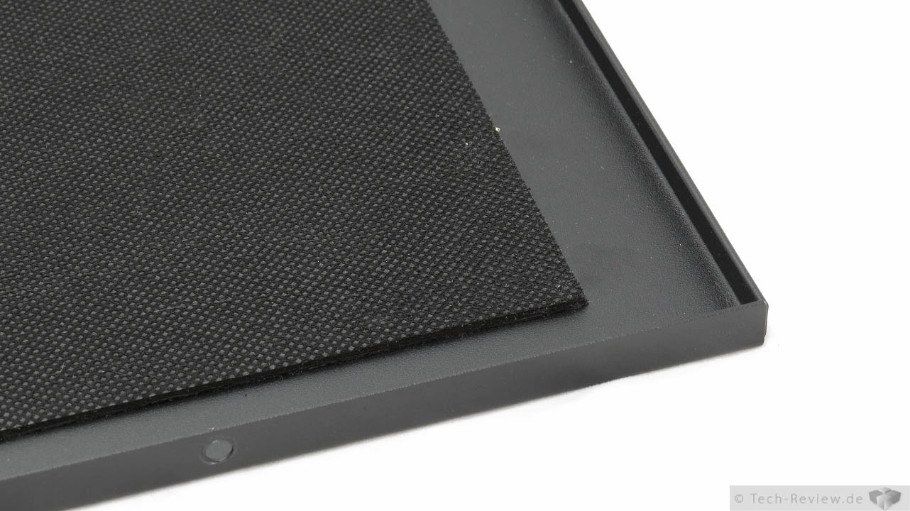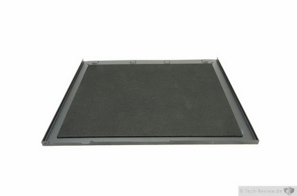 Der Deckel des Node, der zugleich als Oberseite des Gehäuses dient, verfügt über eine sogenannte Schalldämmung. Dieses rund drei Millimeter hohe aufgeklebte Material soll die Geräuschentwicklung des fertigen Computers minimieren. Natürlich ist dies kein Wundermittel für einen leisen PC, eine gewisse Basis für einen leisen Rechner sollte schon vorhanden sein. Die Dämmung stellt dabei eher das i-Tüpfelchen dar, in dem zum Beispiel auch hochfrequente Störgeräusche gefiltert werden.