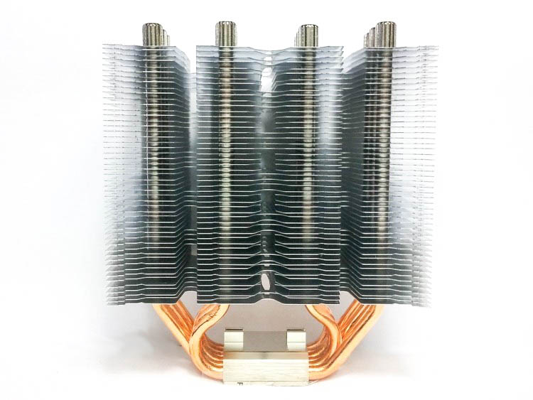 Das der Mugen Max keine vollständige Neuentwicklung ist, fällt dem Leser vielleicht schon am Namen auf (Mugen-Serie), die größte Ähnlichkeit sieht man bei einem Frontalblick auf den Kühlkörper. Wie beim Mugen 4 sind wieder die vier Kühltürme vorhanden. Doch während beim kleinen Bruder die Lamellen versetzt angeordnet sind (lang - kurz), sind jene hier gleich lang. Dafür hat sich Scythe für ein Zick-Zack Muster entschieden, welches sich auch beim Anfassen durch ein Picksen bemerkbar macht. Während es bei den ersten Malen angreifen noch etwas ungut sein mag, obsiegt hier allerdings die wirklich gute Verarbeitung. Auch hat der Mugen Max wohl einer der besten Verarbeitungen in unserem Roundup. Die Lamellen sind allesamt ausgesprochen gut entgratet worden, besser noch als beim Mugen 4.
