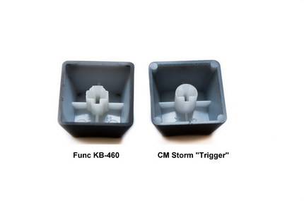 Wurde zum Beispiel bei der Tastatur Trigger des Herstellers Cooler Masters aus der Serie "Storm" ein vollrunder Zylinder, indem das Kreuz ohne Einkerbungen eingebracht wurde, verwendet, so wird hier auf das leicht optimierte Sternenkreuz gesetzt - eben mit der genannten Anfälligkeit gegen Mikrorisse. Warum dies so ist, wissen wir leider nicht, hätten aber gerne die runde Variante vorgefunden, was preislich bestimmt noch im Rahmen gewesen wäre. Der Hersteller Func verwendet an dieser Stelle jedoch auch etwas weicheres Material mit besseren Eigenschaften im Bereich der Elastizität, was wiederum positiv ist. Der Vorteil dabei ist nämlich die gesteigerte Riss- und Bruchfestigkeit.