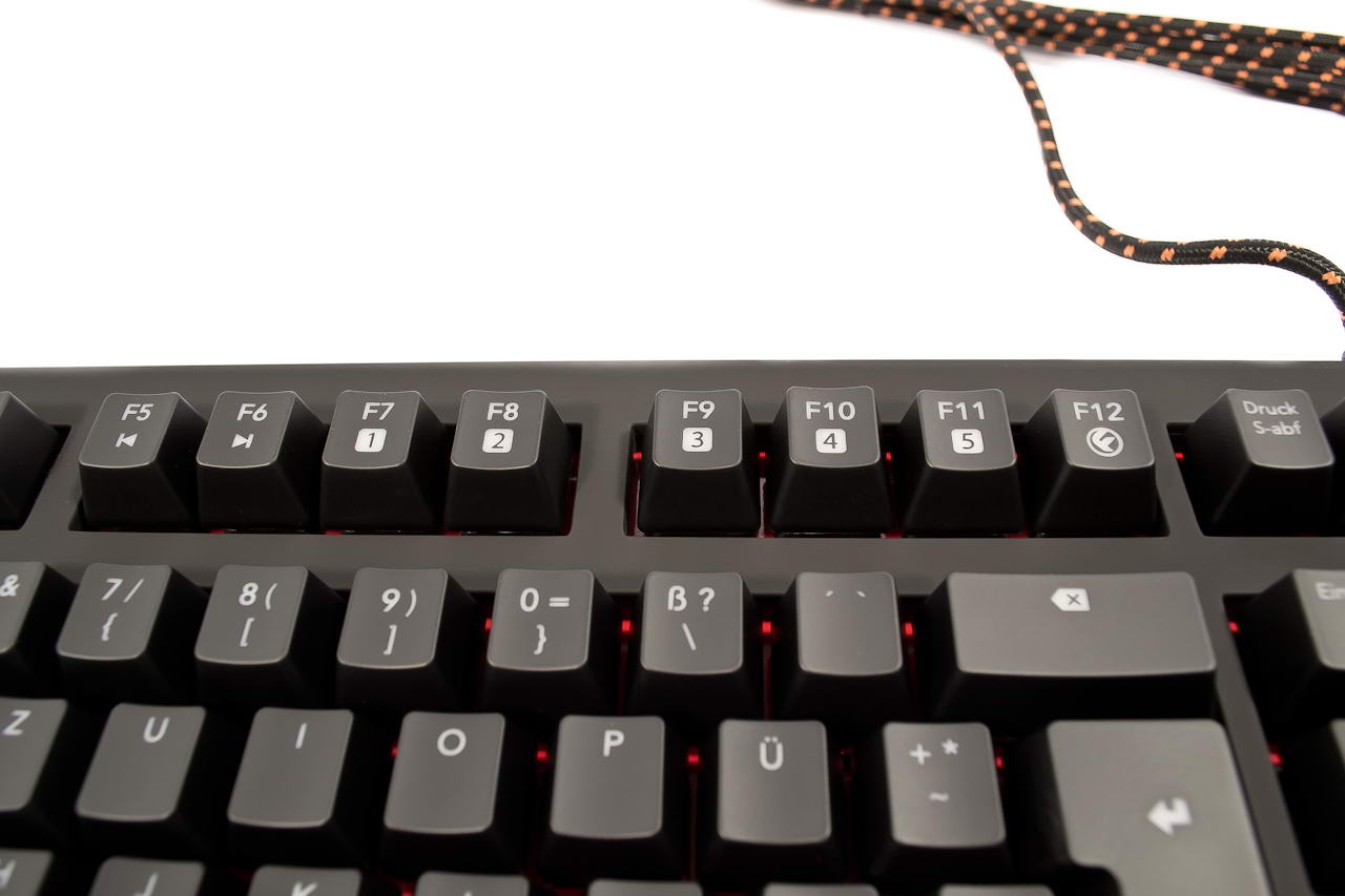 Typographisch präsentiert sich der Sans Serif-Schrifttyp der Tasten als gut lesbar und nicht verschnörkelt, was wir gerade im Gaming-Bereich deshäufigeren antreffen durften. Zumeist litt unter zu spezieller Gestaltungsideen der Tastenzeichen auch die Lesbarkeit. Bei den beleuchteten Tasten kam es hierbei sogar durch den vorhandenen Koronaeffekt der Caps zum leichten Verschwimmen. Func verzichtet durch eine gut lesbare Schriftart auf derlei "Specials", was auch im beleuchteten Zustand den oben genannten Effekt auf den Caps selbst vermeidet - gut so! Da die Ausleuchtung über je eine LED im oberen Teil der Tasten geschieht, hat der Hersteller auch alle Sonderzeichen oder Zweibelegungen in diesen Bereich verschoben. Als Zusatz verwendet Func bei der KB-460 einen rot reflektierenden Layer unterhalb der Tasten, welche das Licht der LED nochmal zurückspiegeln und die Beleuchtung auch in den unteren Bereichen zugute kommt.