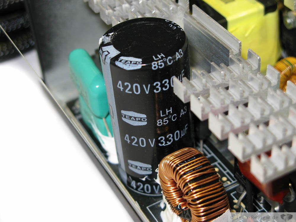 Der Primärkondensator kommt Teapo. Dieses Modell ist auf 85 °C spezifiziert und weißt eine Spannungsfestigkeit von 420 Volt bei 330 mF auf. Eine angemessene Wahl in Bezug auf die Preisklasse von unter 65 Euro.