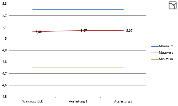 Die Spannungen werden mit Hilfe eines Voltcraft VC-120 Messgeräts ausgelesen. Wir ermitteln die Werte in IDLE und in der Auslastungsstufe 2. Die Messung der Spannungs-Ergebnisse in der Auslastungsstufe 1 lohnt sich kaum bis gar nicht, da sich die Werte so gut wie nicht verändern.
