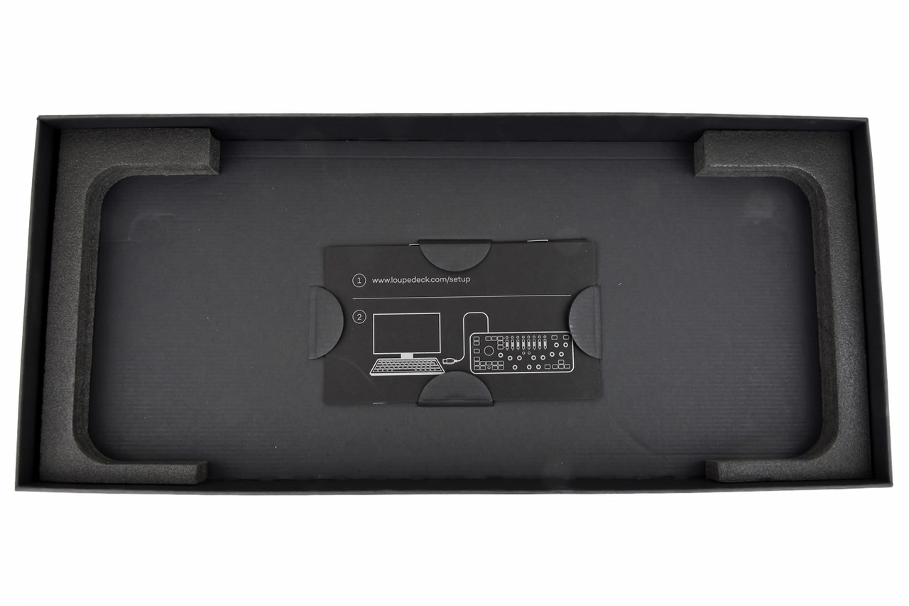 Öffnet man die Verpackung, lacht einem sofort das eigentliche Produkt entgegen, welches an den Seiten mittels Schaumstoff-Polster vor Erschütterungen geschützt ist. Damit dürften Transportschäden eigentlich ausgeschlossen sein. Unter dem Loupedeck+ selbst hat der Hersteller zwei Booklets untergebracht, eines davon sind die Garantiebedingungen und dazu noch ein Link-Hinweis zum notwendigen Download der Software und der PDF-Version des Benutzerhandbuches. Leider ist dieses Dokument auf der Webseite nur in englischer Sprache verfasst, eine deutsche Version sucht man vergebens.