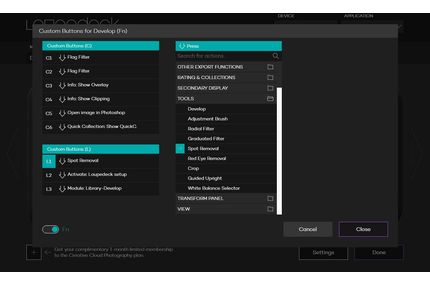 Ganz links außen positioniert sind die drei kleinen Taster L1 bis L3, genauso wie C1 und C2 auf zwei Schaltern im rechten unteren Bereich, die allesamt vom Benutzer genau wie jene an anderen Stellen des Loupedeck+ (C3 bis C6 sowie D1 und D2) mit eigenen Funktionen frei belegbar sind. Auffällig ist, dass die Positionen der verschiedenen Tasten und Regler über das gesammte Board verteilt liegt, dazu kommen noch die unterschiedlichen Formen der Tasten, welche sich an die jeweilige Umgebung anpassen. So wurden C1 und C2 als große Schalter ausgeführt, um sich mit in die anderen, gleichförmigen Bedienelemente rund um ihre Position einzufügen. Copy und Paste, zwei sehr beliebte Funktionen, hat das Loupedeck natürlich auch mit an Bord, allerdings dank eines kleinen Tricks mit doppelter Belegung. Durch einen einfachen Druck auf Copy werden alle aktuellen Bearbeitungen in den Zwischenspeicher kopiert, um jene mittels Paste auf ein weiteres Objekt anzuwenden, beispielsweise die Belichtungswerte eines Bildes. Mit dem kleinen, runden Fn-Schalter unten links als zusätzliche Auswahl zu Copy/Paste erstellt der Benutzer hingegen eine Kopie des aktuell geöffneten Bildes und fügt jenes mit der entsprechenden Kombination von "Fn+Paste" wieder ein.