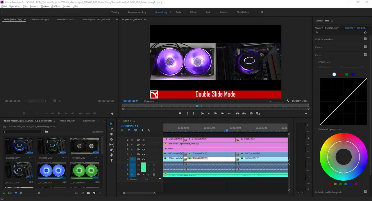Insgesamt ist die Komplexität von Premiere Pro fast etwas zu viel für das Loupedeck+, da dieses Programm viele Einstellungsfenster bietet, wo die Tastatur einfach nicht ignoriert werden kann. Loupedeck hat viele Funktionen belegt und diese auch in der hübschen Anleitung dazu aufgelistet, leider scheitert eine durchgehende oder zumindest nicht ständig unterbrochene Bedienung aber an der Komplexität von Premiere Pro und der damit einhergehenden hohen Einstiegshürde bei der Bedienung mittels des Loupedeck+. Mit der Maus kommt man in vielen Fällen schneller zum Ziel, sei es durch den schnellen Sprung zwischen den einzelnen Flächen, beispielweise Zeitleiste und Medien-Browser, oder mit dem einfacheren Platzieren von Clips und so weiter. Praktisch bleiben, hier kann man definitiv nicht streiten, weiterhin die Schalter für den Vorher-Nachher Vergleich, zum Anschauen des Videos im Vollbild und Export. Ganz im eigenen Element ist das Loupedeck bei den Lumetri-Farbeinstellungen, wo das Konfigurieren sehr angenehm von der Hand und es definitiv schneller von Statten geht als noch mit der Maus.