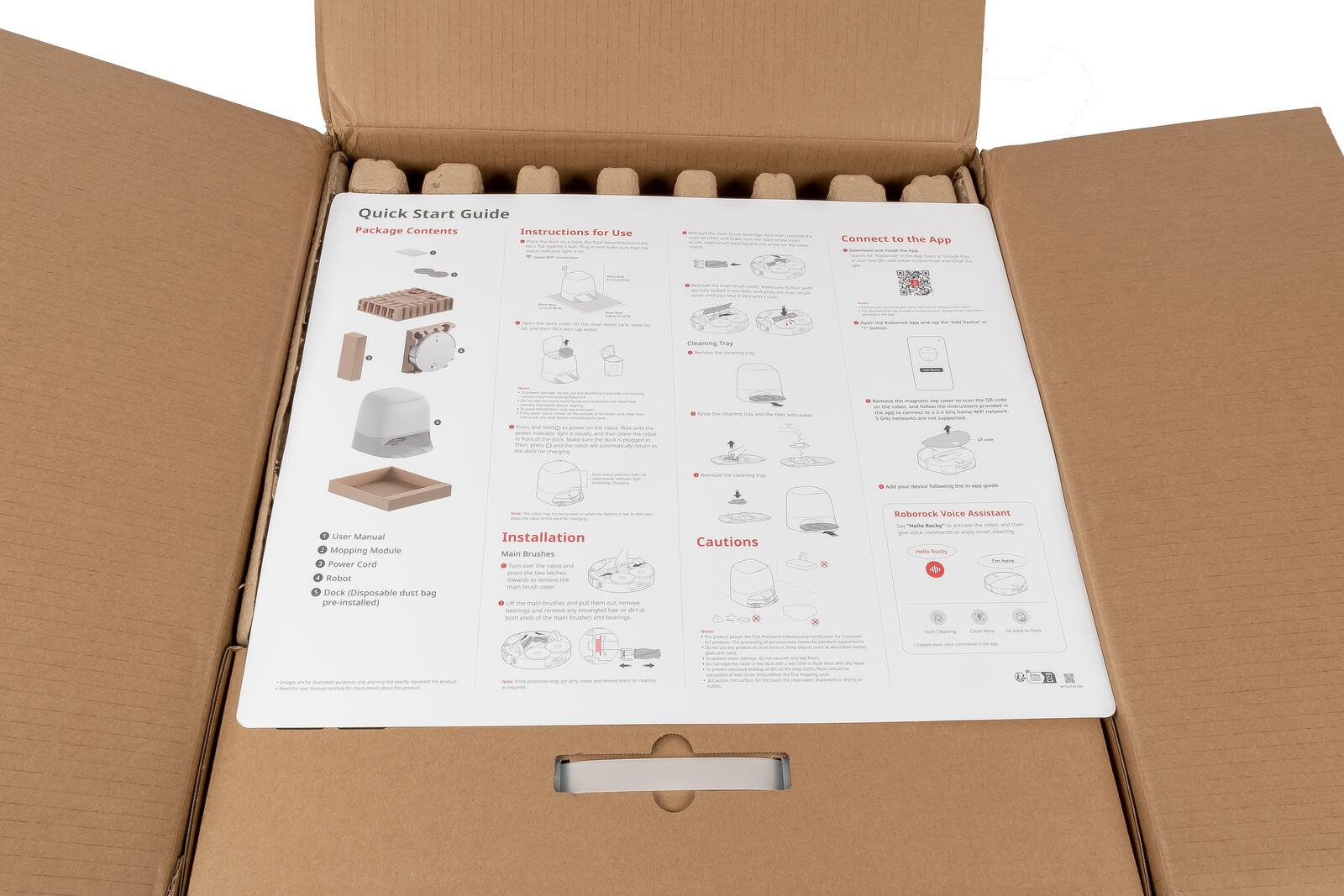 Roborock liefert das Gerät in einem schlichten, aber funktionalen Karton aus - Innen ist alles sauber in mehrere Ebenen unterteilt. Direkt obenauf liegt aber erst einmal ein großzügig gestalteter Quickstart-Guide, der die wichtigsten Schritte zur Ersteinrichtung erklärt. Leider gibt es ihn nur in Englisch, bei einer international einheitlichen Verpackung nachvollziehbar, für ein Produkt im deutschen Handel aber trotzdem etwas schade. Die Illustrationen sind allerdings so klar gehalten, dass man auch ohne viele Worte schnell versteht, welche Komponenten wohin gehören und wie der erste Aufbau funktioniert. Der Guide führt dabei durch die Montage der Station, zeigt die wichtigsten Bedienelemente und enthält praktische QR-Codes für den App-Download aufs Handy.