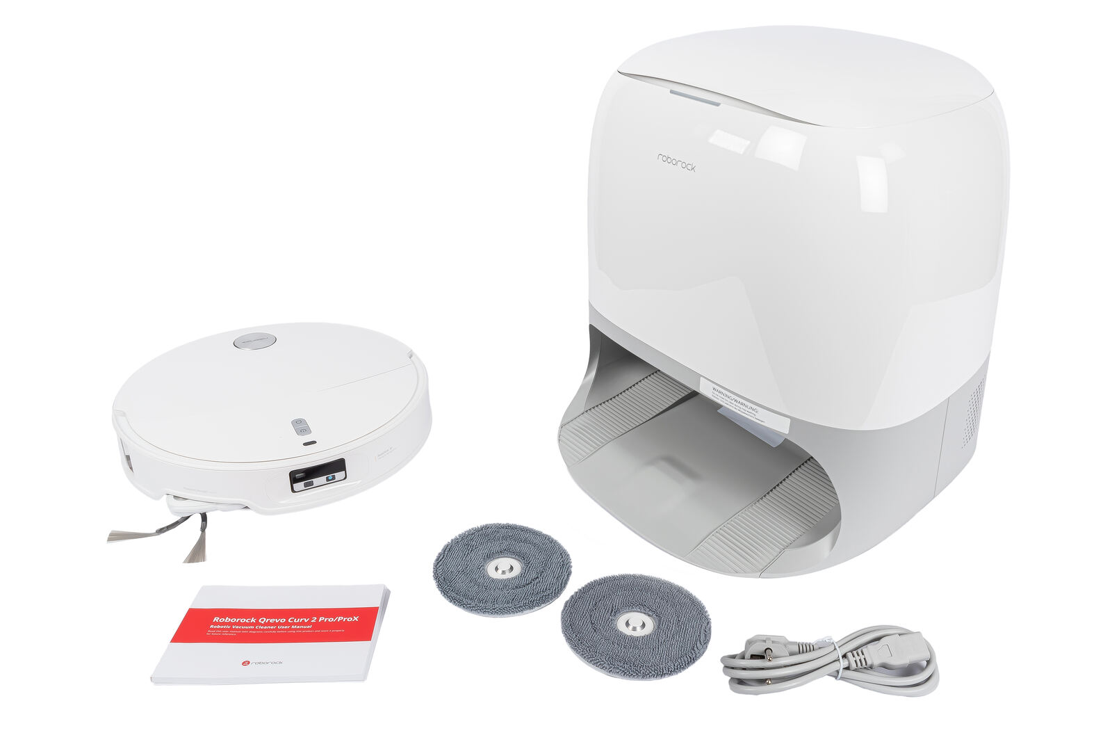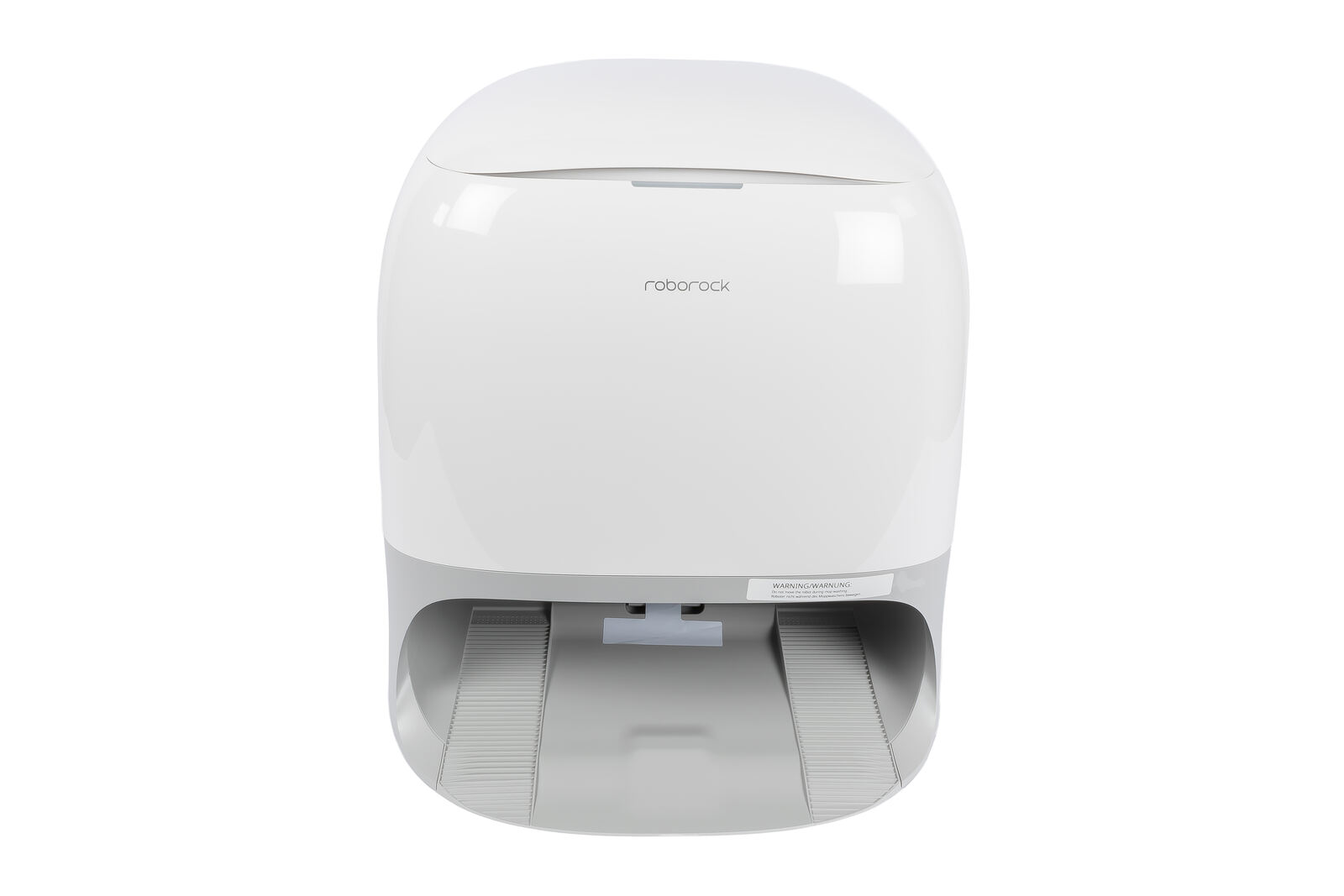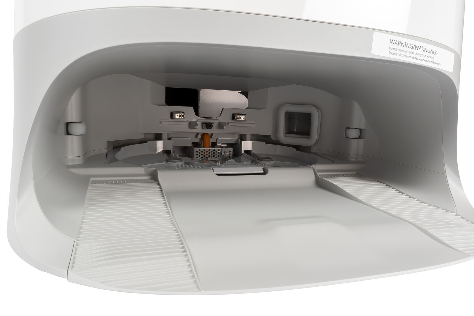 Ein Warnhinweis oberhalb der „Einfahrt“ erinnert daran, den Roboter während des Moppwaschens nicht zu bewegen. Der Hintergrund ist simpel: Der Curv 2 Pro kann seine Mopps in der Station jederzeit ablegen und wieder aufnehmen: