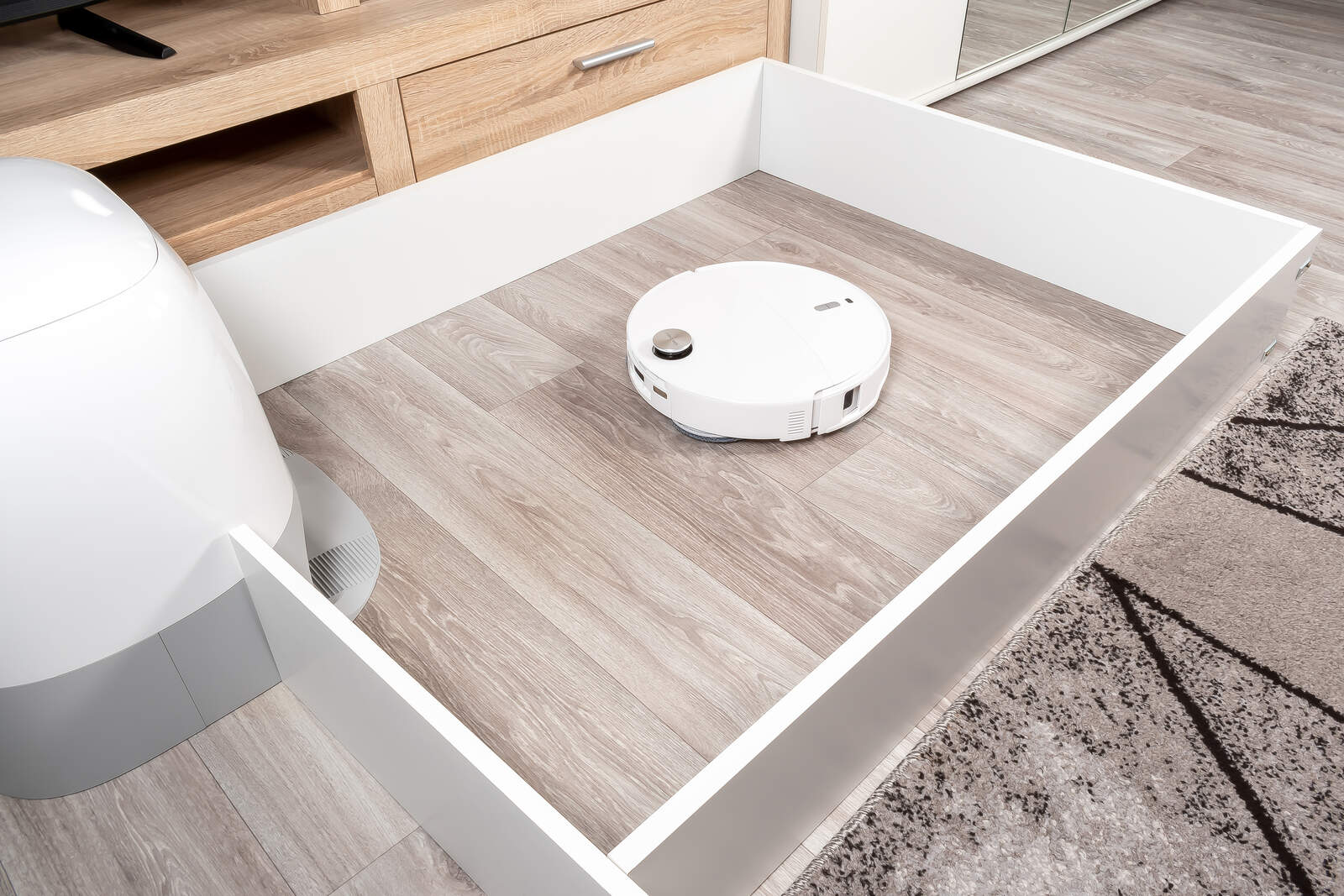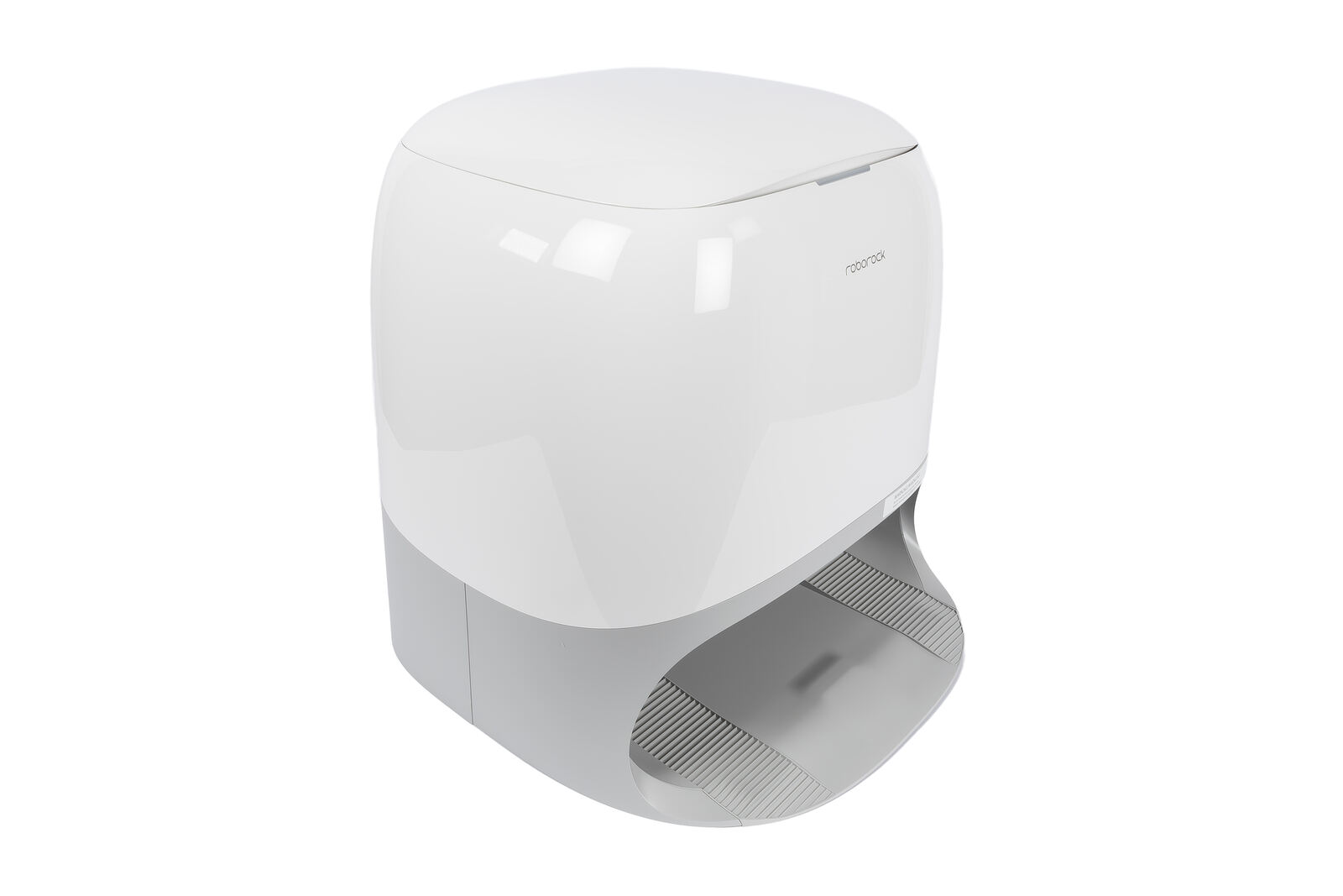 Die unter dem großen Namen "Multifunktions-Dockingstation 3.0 Hygiene+" bezeichnete Station des Curv 2 Pro fällt zumindest erstmal optisch deutlich auf. Roborock verzichtet hier auf das meist übliche kantige, rein funktionale Design, wie es viele andere Hersteller verwenden und setzt stattdessen auf eine glatt geschlossene, hochglänzende Oberfläche mit rundem, fast schon organischem Formfaktor. Im Raum wirkt das dadurch eben nicht wie ein typisches Haushaltsgerät, das man am liebsten irgendwo hinter einem Vorhang verstecken möchte, sondern eher wie ein eigenständiges Designobjekt. Die wiederum in Grau gehaltene, matt gestaltete breite Fahrmulde und die offene Front nehmen dem Ganzen wieder etwas von dieser Eleganz, sind aber funktional und so ausgeführt, dass sie optisch doch stimmig wirken.