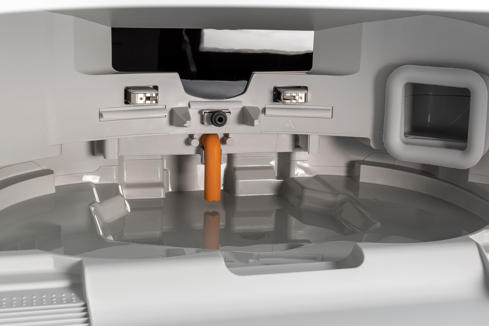Schaut man genauer ins Innere, wird schnell klar, wie viel Technik Roborock in der Station untergebracht hat. Auf der einen Seite der Versorgungseinheit sitzen die Ladekontakte, über die der Roboter seinen Akku auffüllt, sobald er andockt. Daneben findet man mehrere Zulauf- und Absaugdüsen, die für den Austausch zwischen Station und Gerät zuständig sind: Frischwasser wird eingespeist, Schmutzwasser abgezogen und der Staubbehälter entleert. Auffällig ist außerdem das orangefarbene Verbindungselement, über das die Station heißes Wasser in den Reinigungsprozess einmischt.