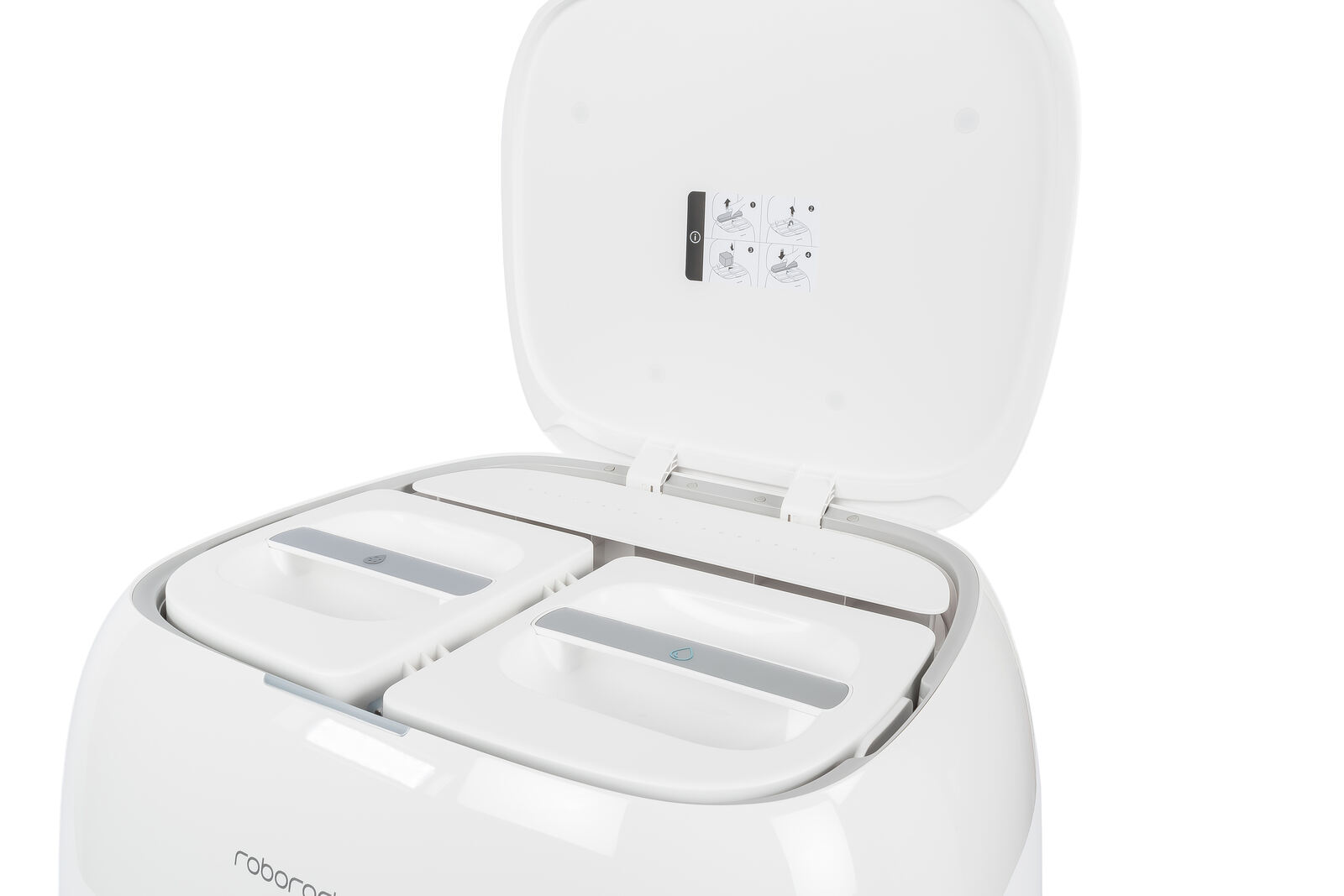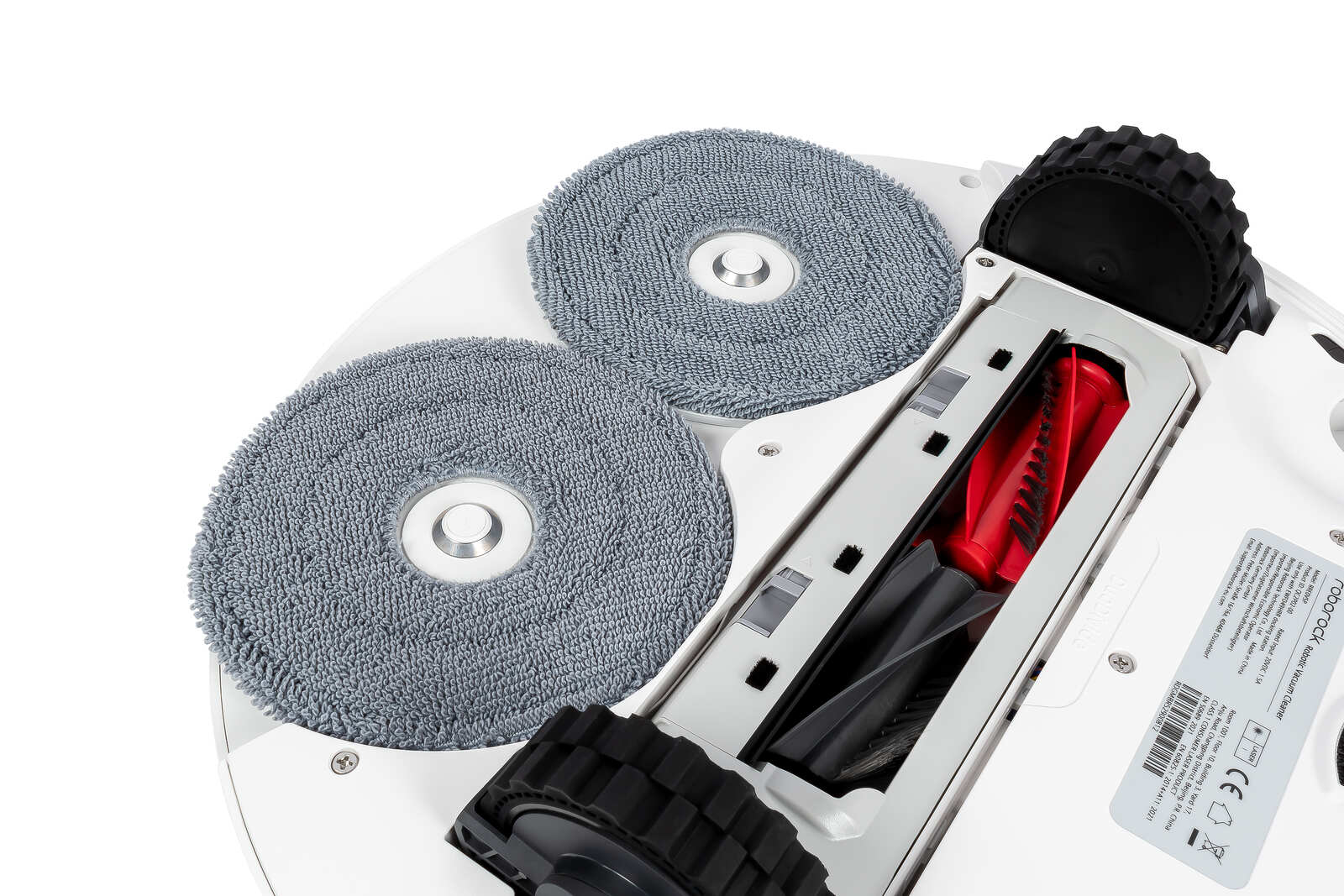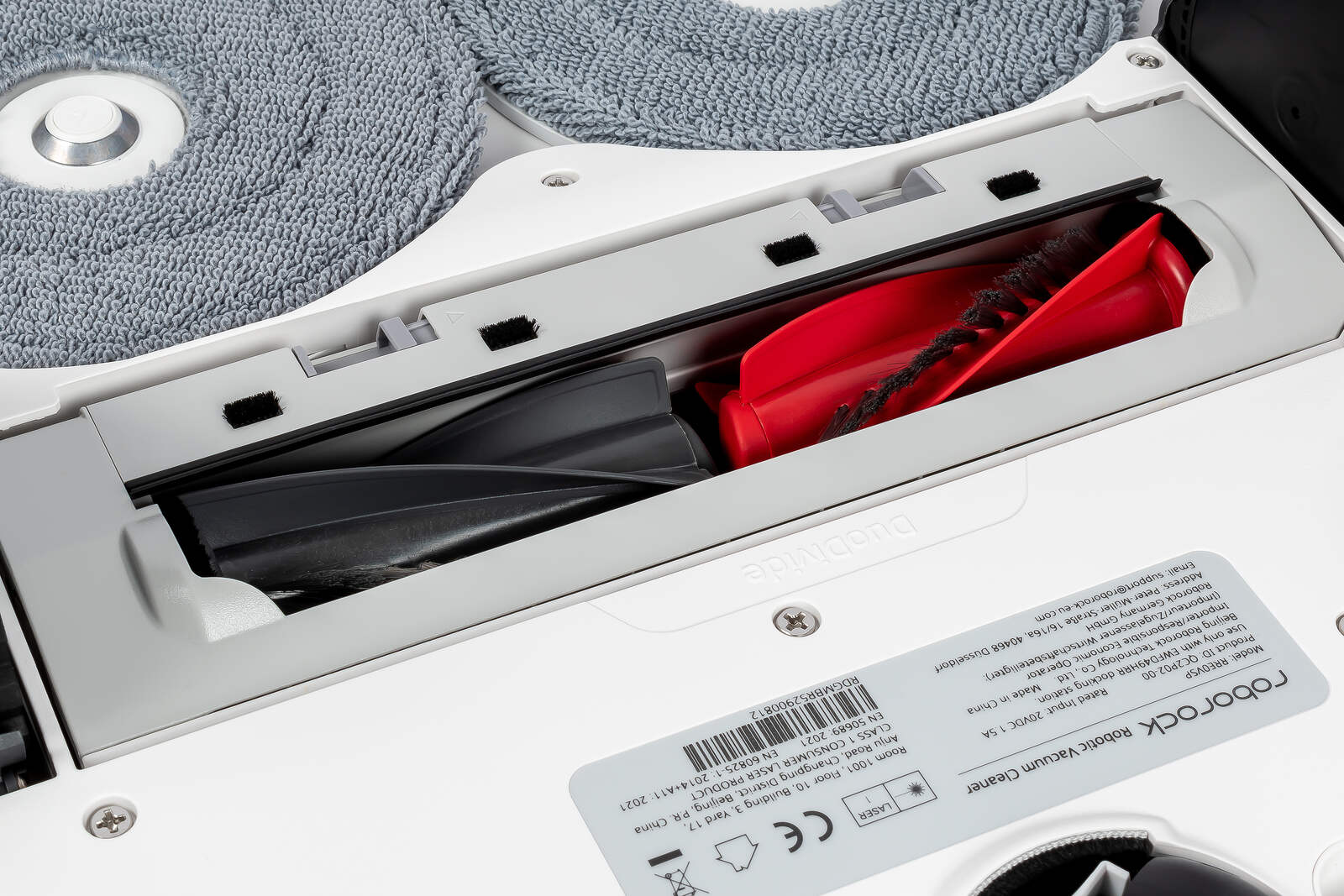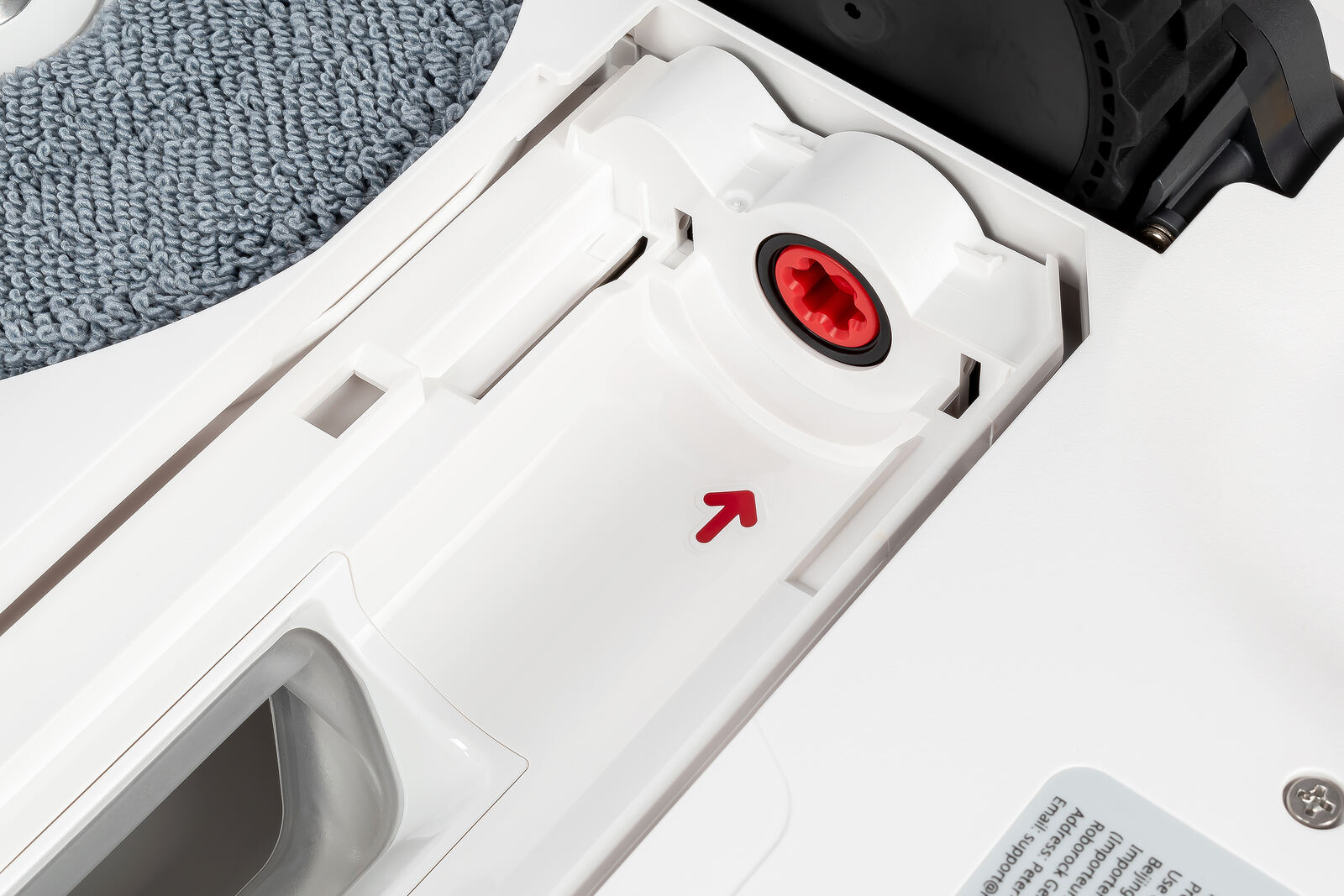 Eine der Kernaufgaben der Station ist es, den Roboter zuverlässig mit Frischwasser zu versorgen, die Mopps vor der Fahrt anzufeuchten und sie nach getaner Arbeit wieder zu reinigen. Im Mittelpunkt steht dabei die automatische Mopp-Reinigung. Nach Abschluss eines Reinigungsauftrags fährt der Bot zurück ins Dock und lässt seine beiden Mopps dort mit erhitztem Wasser reinigen. Dieses Wasser wird in der Station aufgeheizt und anschließend in das Reinigungstray geleitet. Dort drehen sich die Mopps über eine Reinigungsplatte mit Noppen und Abstreifstegen, werden kontinuierlich mit Wasser gespült und so von anhaftenden Verschmutzungen befreit. Das entstehende Schmutzwasser wird anschließend in den separaten Schmutzwassertank gepumpt.