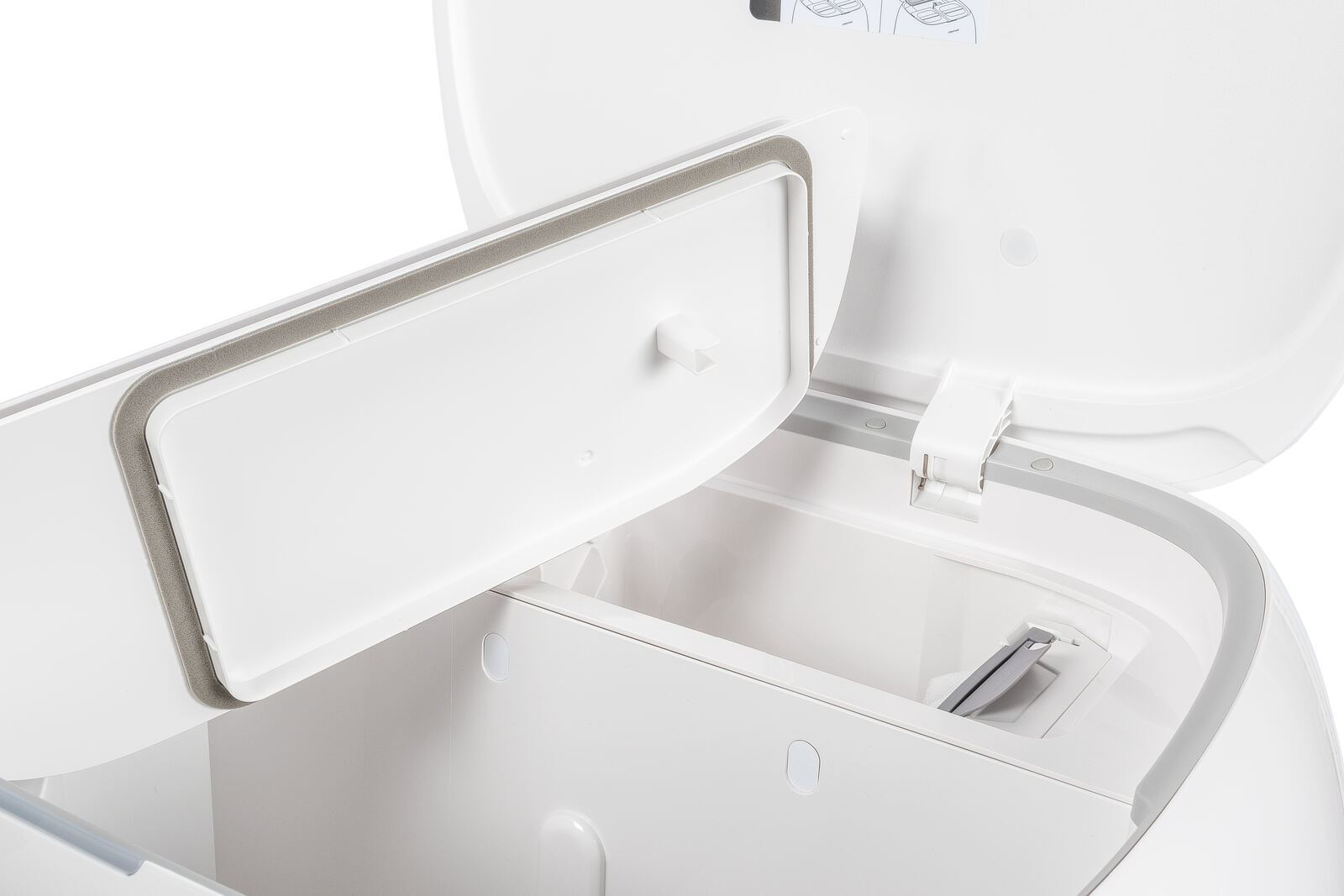 Der obere Bereich ist zugleich der Zugang zu den Wassertanks sowie dem Staubfilter und lässt sich mit einem sehr angenehmen Scharnier-Mechanismus wirklich sehr „smooth" öffnen. Im Deckel selbst klebt ein kleiner Info-Sticker, der einem Auskunft darüber gibt, wie der Staubbeutel zu wechseln wäre - bisschen unförmig ist die Piktogramm-Darstellung des Beutels, hier hatten wir zunächst angenommen, es gäbe optional auch einen beutellosen Behälter, aber dem war leider nicht so. Über die Entnahme der hinteren Abdeckung gelangt man zum Staubbeutel, welcher bedauerlicherweise nicht wiederverwendbar ist (es gibt jedoch Firmen, die für den Curv 2 Pro auch Beutel mit Reißverschluss anbieten). Frontseitig hat Roborock an der Station noch eine großzügige Status-LED, angebracht, die einem direkt entgegen leuchtet und den aktuellen Status mit einer wechselnden Farbe oder mit Blinken aufzeigt. Alles wirklich auch im Inneren formschön umgesetzt, alles ist abgerundet und es gibt kaum rechte Winkel - gefällt uns wirklich.
