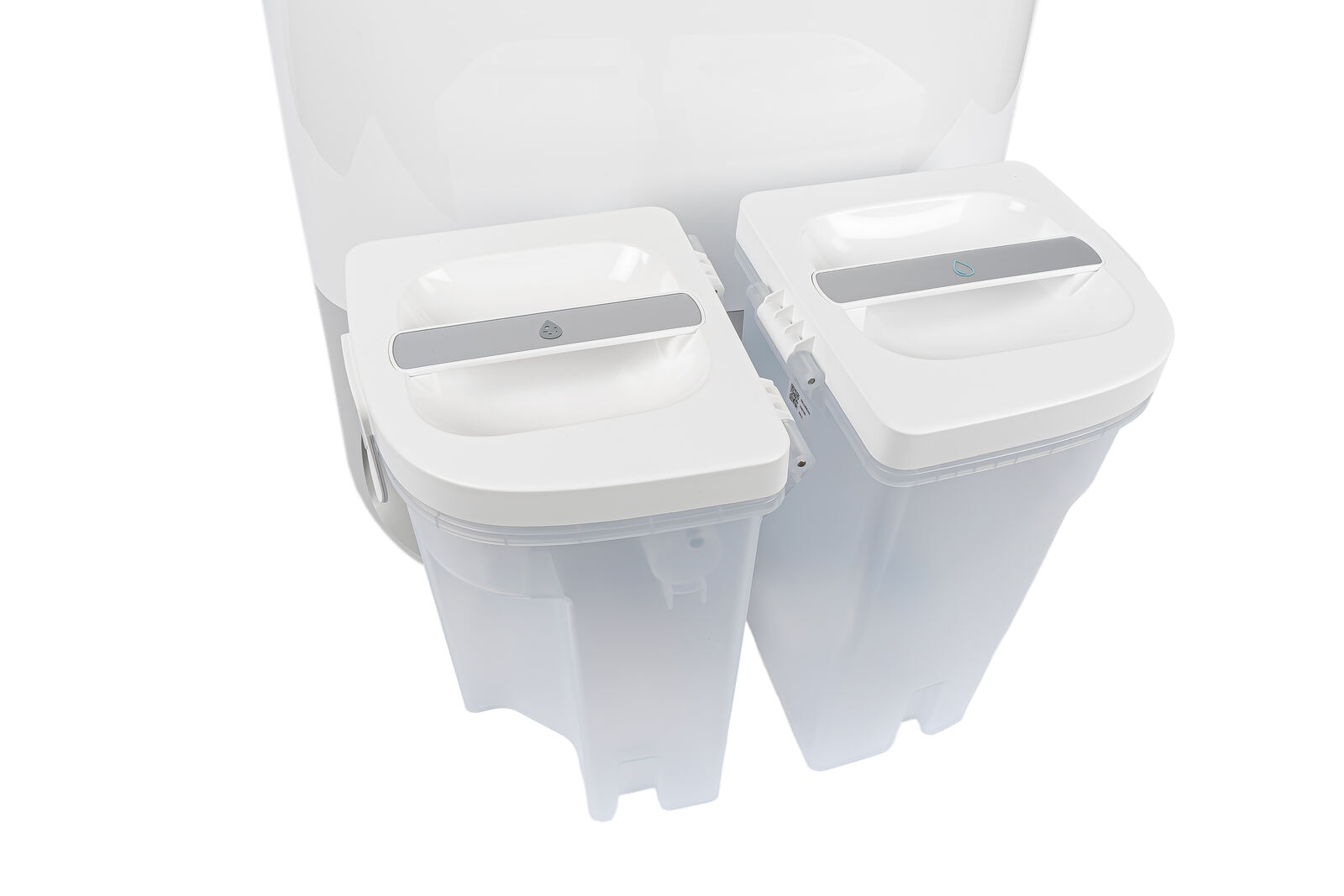 Im vorderen Bereich der Station sitzen die beiden Tanks für Frisch- und Schmutzwasser, die sich mit der Griffmulde um jeweiligen Deckel problemlos herausnehmen lassen. Beide bestehen aus stabilem Kunststoff, die Deckel wirken sehr hochwertig verarbeitet und vermitteln auch voll-befüllt keinen Eindruck von Schwachstellen. Der Frischwassertank fällt bewusst etwas größer aus, denn beim Wischen bleibt immer eine gewisse Restfeuchtigkeit auf dem Boden oder in den Mopps zurück, sodass der Verbrauch höher ist als beim reinen Auffangen des Schmutzwassers.