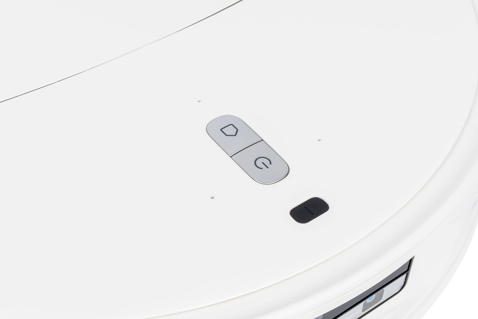 Auf der Oberseite sitzt im hinteren Bereich der bereits erwähnte, vollautomatisch einfahrbare LiDAR-Turm, der sich optisch mit der gebürsteten Aluminium-Optik hervorhebt, aber nur so viel Platz einnimmt, wie technisch notwendig ist. Weiter vorne findet man die wenigen, aber sinnvoll platzierten Bedienelemente sowie den dToF-Höhensensor. Wichtig ist hierbei noch zu sagen, dass man es tunlichst unterlassen sollte, den Turm selbst mit der Hand herunterdrücken zu wollen (was kleine Kids ja gerne tun), da dann der Mechanismus Schaden nehmen kann - also drauf achten!. Die beiden vorderen Bedienknöpfe sind klar strukturiert, und von den Piktogrammen her auch selbsterklärend. Um die Tasten herum sind drei Löcher zu sehen, unter denen sich vermutlich die Mikrofone für die Sprachbefehle verbergen.