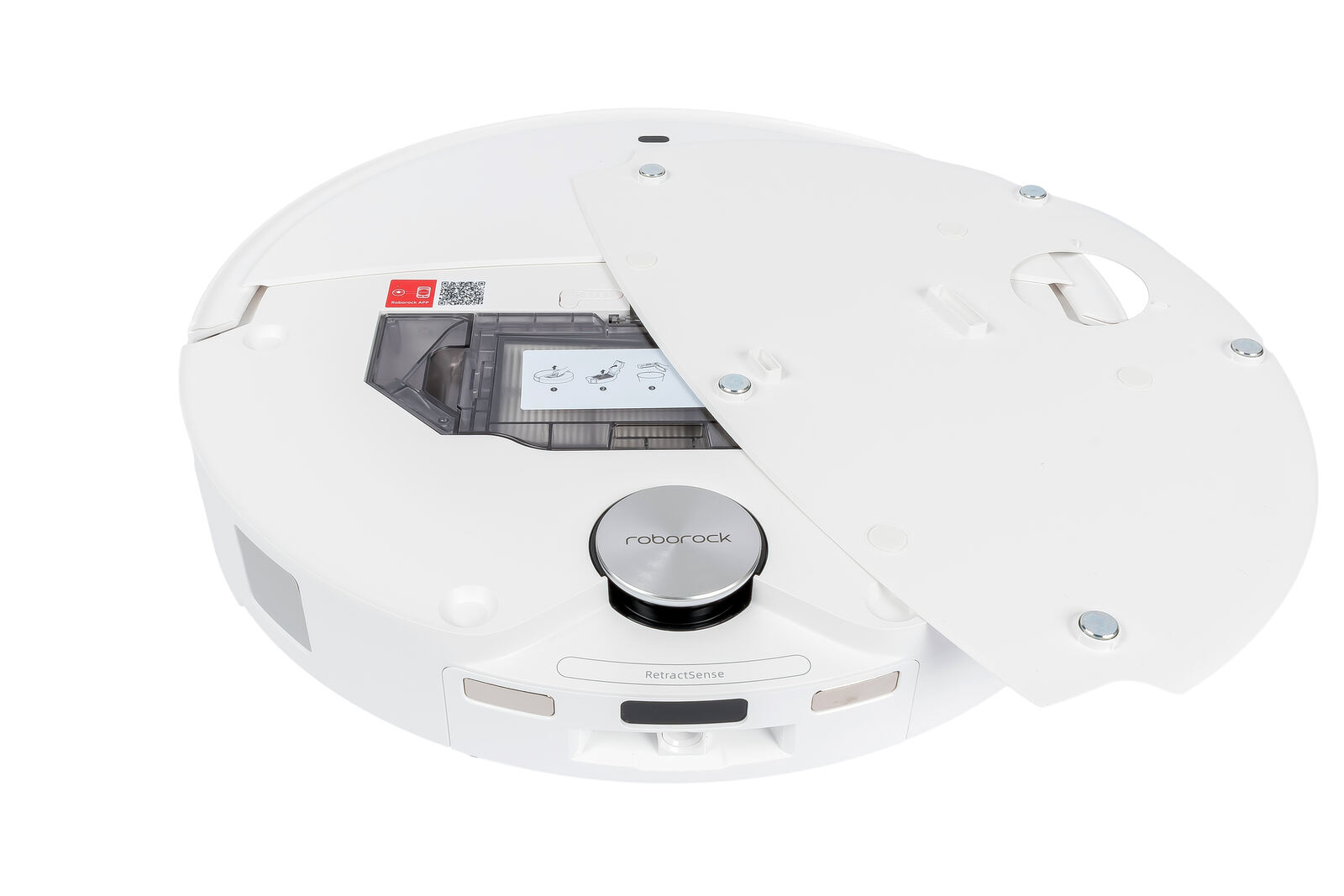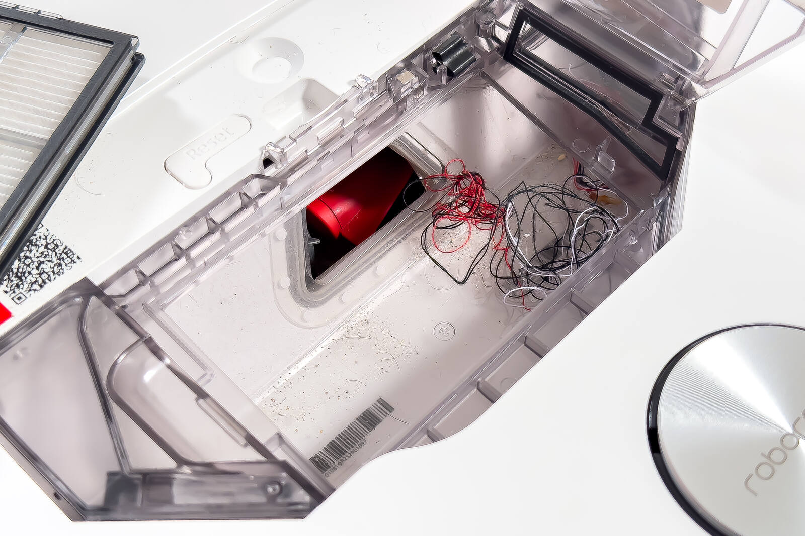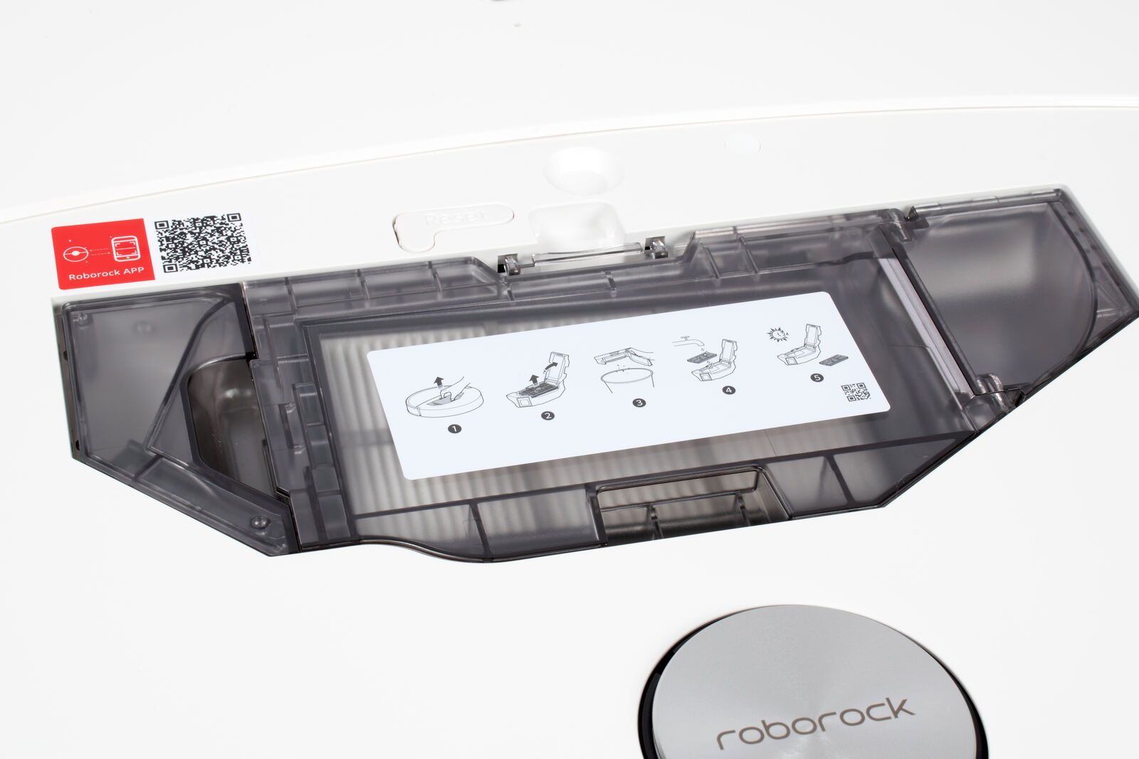Im Bauch des Bots, versteckt unter der über Magneten gehaltenen Abdeckung, sitzt der entnehmbare Staubbehälter. Er fasst rund 270 ml und ist damit für eine durchschnittliche Wohnung mehr als nur ausreichend dimensioniert, ohne dass man ständig entleeren müsste. Man hat also genug Kapazität, bis der Sauger zur Absaugung wieder ins Dock fährt. Die angesaugte Luft wandert dabei stets durch eine HEPA-Filterkartusche, die feine Partikel und Allergene zuverlässig zurückhält - Allergiker wird das sehr freuen.