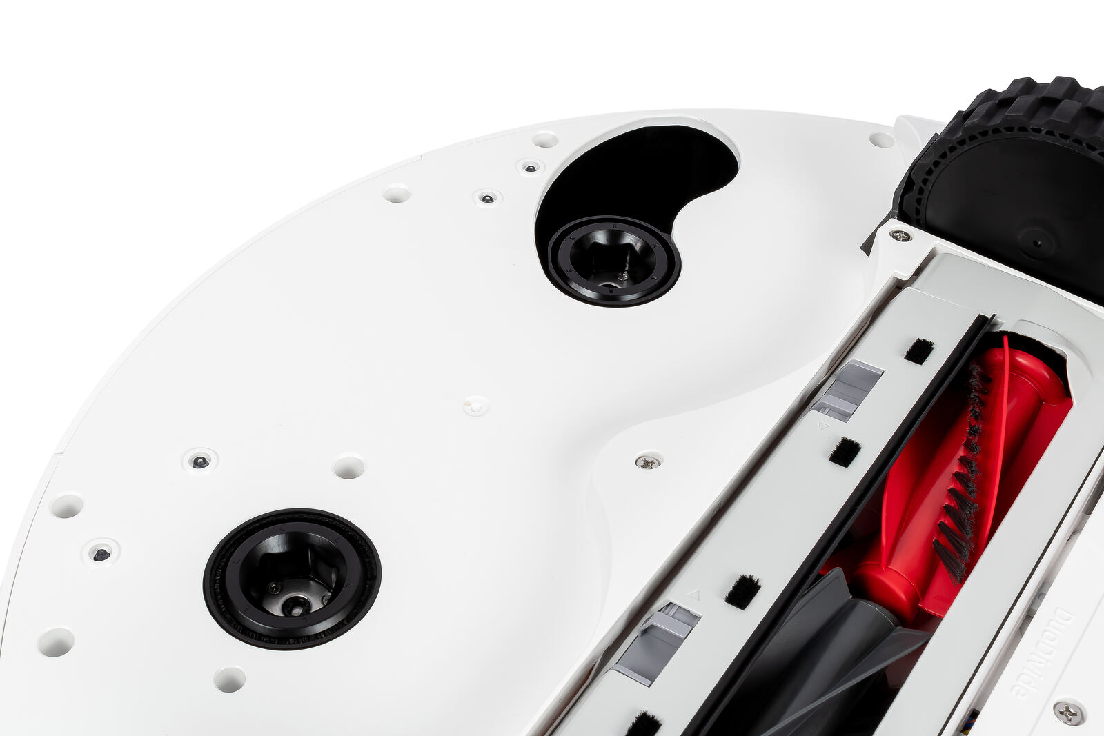 Zentral sitzt die als „Duo-Divide" bezeichnete Hauptbürste: eine zweiteilige Hybridrolle aus Gummilamellen und Borsten, die auf Hartboden wie auch auf Teppich zuverlässig Material aufnehmen soll. Die Bürste ist in einer schwimmend gelagerten Halterung verbaut, sodass sie sich automatisch an leichte Bodenunebenheiten anpasst und der Kontakt zum Untergrund konstant bleibt. Das Arbeitsprinzip des „Dual Anti-Tangle-Systems" wird auch mit einem vierphasigen Reinigungsansatz beschrieben: