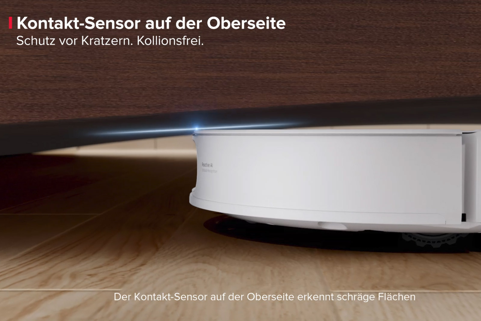 Unterhalb der Kamera und entlang des halben Saugroboters verläuft eine leicht gewölbte Stoßleiste, in die Roborock die Kontaktsensoren integriert hat. Sie reagiert, sobald der Sauger ein Objekt tatsächlich berührt, und liefert der Navigation eine eindeutige Rückmeldung. Die Leiste ist flexibel gelagert und federt bei Kontakt leicht ein - genug, um Schäden am Hindernis oder am Gerät selbst zuverlässig zu vermeiden.