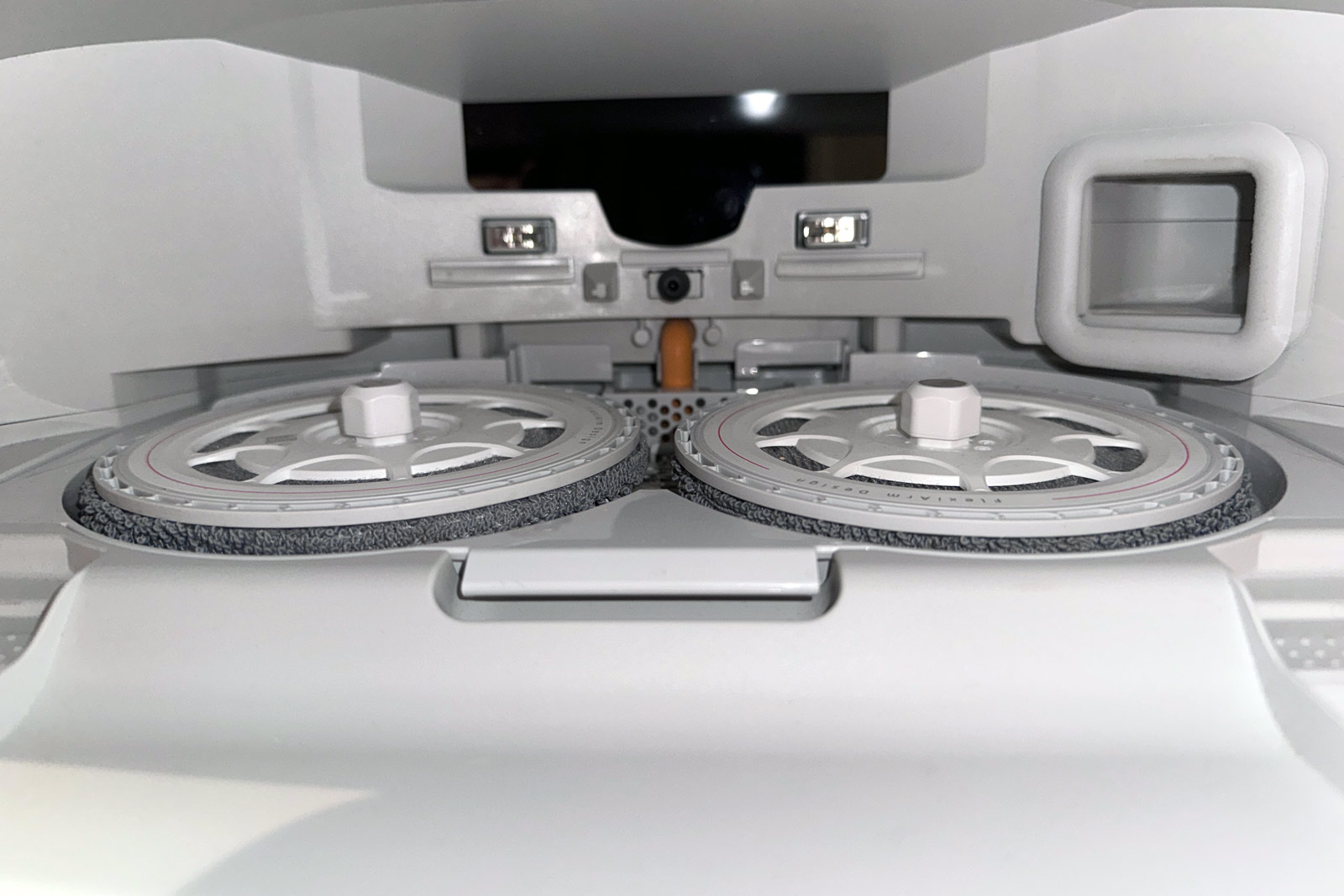 Ab Werk sind die Moppteller noch nicht montiert, was dank des magnetischen Arretierungssystems aber in wenigen Sekunden erledigt ist. Einfach ansetzen, der Mechanismus greift selbstständig, und die Pads sitzen sicher an ihrer Position. Auffällig ist, dass der rechte Moppteller (Draufsicht) seitlich ausfahren kann. Diese Flex-Funktion soll die Kantenreinigung verbessern und ermöglicht es dem Roboter, auch sehr dicht an Hindernissen wie Tisch- oder Stuhlbeinen entlang zu wischen.