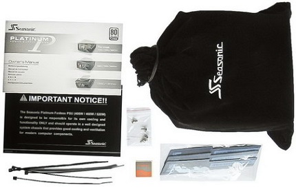 Ein Teil des hohen Kaufpreises relativiert sich beim Auspacken des Lieferumfangs, denn dieser fällt im Vergleich mit den meisten anderen Netzteilen geradezu gigantisch aus. Ganze drei Fotos haben wir an dieser Stelle der gesamten Ausstattung gewidmet, das dürfte ein neuer Rekord sein. Das Netzteil ist in einem edel anmutenden Beutel verpackt, welcher zudem hervorragend gegen Kratzer und Stöße schützt. Neben einer Bedienungsanleitung finden wir auch den ersten Hinweis bezüglich der richtigen Verwendung des Netzteils.