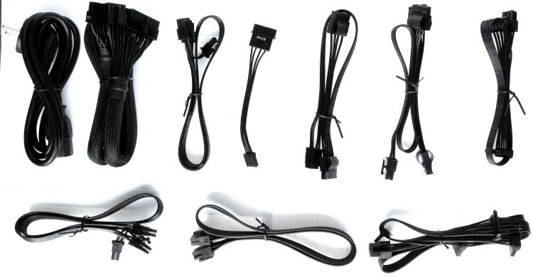 Neben dem Kaltgerätestecker finden wir einen kompletten Kabelsatz vor, denn das Seasonic Platinum Fanless verfügt über ein vollmodulares Kabelsystem. Als einzige Ausführung in rund kommt das dicke ATX-Kabel daher, alle anderen Kabel sind als Flachbandversionen ausgeführt. Eine Diskussion wollen wir an dieser Stelle nicht starten, aber unserer subjektiven Meinung nach fühlen sich Rundkabel hochwertiger an und würden daher besser zum Anspruch dieses Netzteils passen.