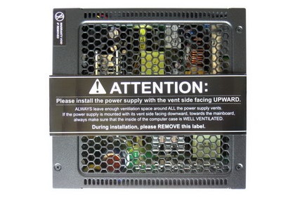 Befreit man das Netzteil nun aus dem Beutel, so fällt zuerst ein weiterer Warnhinweis auf. Dieser verdeutlicht noch einmal den richtigen Einbau, die wabenförmigen Luftauslässe müssen immer frei bleiben und nach oben zeigen. Das restliche Äußere ist relativ unspektakulär, einzig die großen offenen Flächen fallen auf. Die vollmodularen Anschlussmöglichkeiten fallen übersichtlich und klar gegliedert aus.