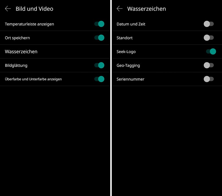 Der erste Punkt hierbei ist "Voreinstellung", dort lässt sich festlegen in welcher Temperatureinheit (ob C = Celsius, K = Kelvin oder F = Fahrenheit) die späteren Messungen erfolgen sollen. Standardmäßig war hier bereits Celsius voreingestellt. Das Seitenverhältnis kann zwischen 4:3 und 16:9 gewählt und darüber hinaus auch ein Wasserzeichen bestimmt werden. Dieses kann einmal als Einblendung von Datum und Uhrzeit geschehen, per Standort-Angabe in Form von Koordinaten oder über das SEEK-Herstellerlogo. In den JPEGs lassen sich darüber hinaus Geo-Daten über das sogenannte Geo-Tagging hinterlegen. Positiv hervorzuheben ist, speziell weil wir auch den Vorgänger im Test hatten, dass der Button "Nutzungsdaten senden" nun nicht mehr standardmäßig aktiviert wurde, wie es im Fall der vorherigen Version stattfand und von uns stark kritisiert wurde. So eine Funktion muss eben entweder deutlich kommuniziert werden, oder aber den manuellen Eingriff des Anwenders zur Aktivierung bedürfen. Alles andere wäre wohl nicht im Sinne des Datenschutzes, oder der persönlichen Entscheidung des Nutzers.
