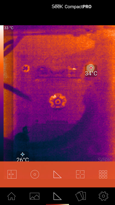 Apropos Temperatur: Hier hat Seek Thermal endlich auch die Emissionsfaktoren mit einbezogen, leider ist die implementierte Funktion nicht vollumfänglich zu unserer Befriedigung umgesetzt worden. Eine manuelle Eingabe des Koeffizienten wäre ein ganz klares "nice-to-have" für die nächsten Versionen der App. Wird der richtige Oberflächenfaktor ausgewählt, ist die angegebene Temperaturmessung sehr genau. Um dies zu überprüfen haben wir denselben Punkt mit unserem Scan Temp RH 860 Infrarot-Thermometer gemessen, wobei es nur zu sehr minimalen und vernachlässigbaren Abweichungen kam. Insgesamt ein sehr gutes Ergebnis.